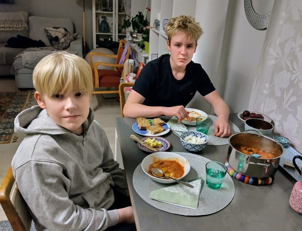 Ensimmäinen kattaus lohi ja perunat maistuivat Jaanalle ja minulle. Miika soitti, että hän on tulossa poikien kanssa käymään mökillä ja he voivat poiketa katsomassa minua. Kysyin, laitanko ruokaa? Linssikeitto kelpaisi, poika ilmoitti.