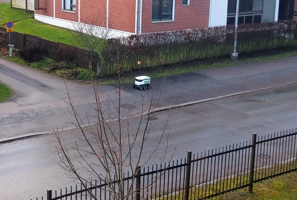 Kurkistin iltapäivällä parvekkeelta, joko sade on loppunut. Näin ensimmäisen kerran robotin Vuorikadulla.