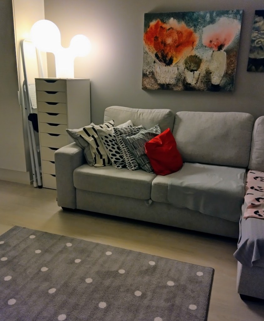 Sain myös uutta ilmettä kotiin, kun Anna toi turvallisen liukuestepohjaisen maton olohuoneeseen ja Jaana palautti vierihoidossa olleen mikkihiirilampun.