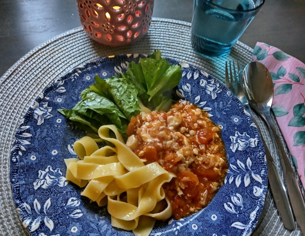 Kokeilin, miltä mieto silkentofu maistuu pastan kera. Tein vahvan tomaattipohjaisen kastikkeen, johon tuli salotti- ja valkosipulia sekä chilitahnaa.