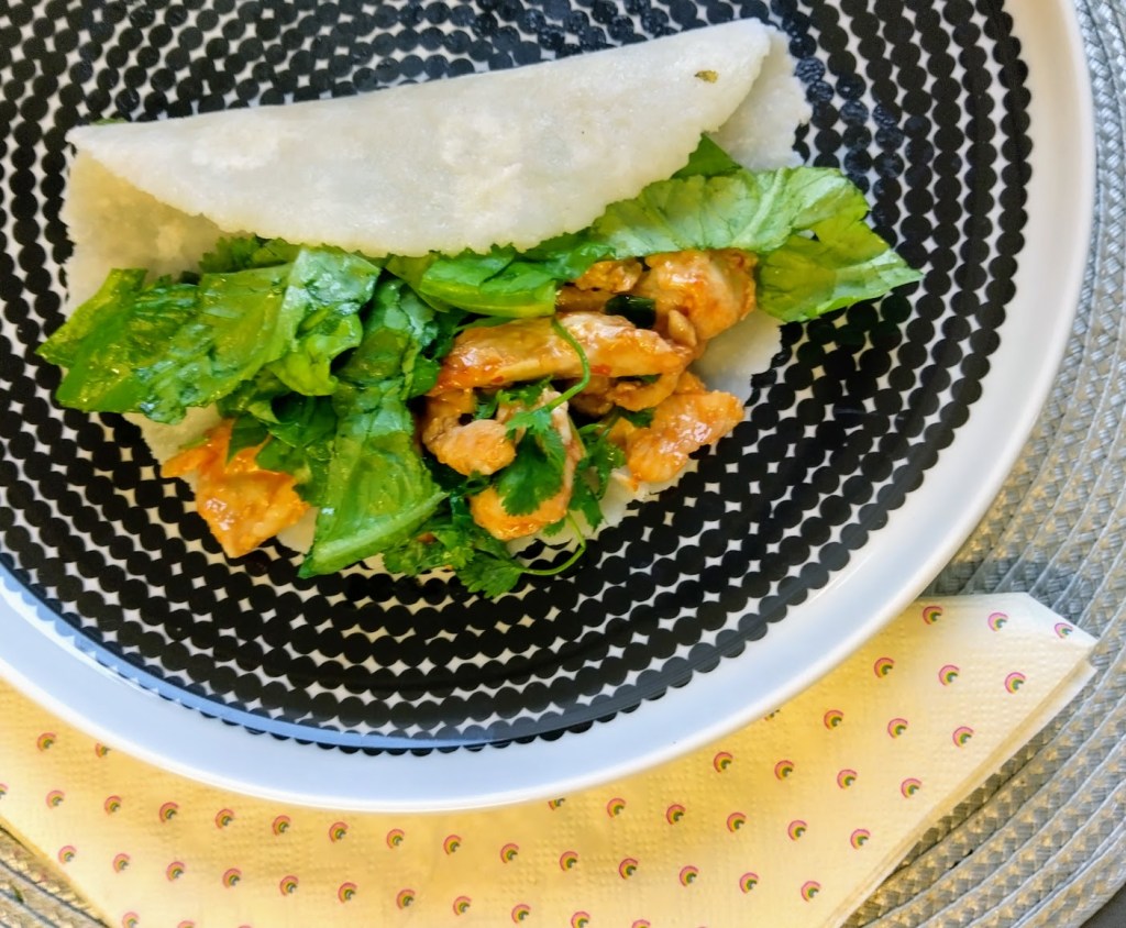 Maistelimme siskon kanssa wrapeja vahvan valkosipulikastikkeen kera. Höyrytin lettuset oikeaoppisesti. Sekoitin maustekastikkeen broilerisuikaleiden joukkoon ja lisäsin tuoretta ruohosipulia, korianteria sekä salaatinlehtiä. Wrapit olivat turhankin mietoja, mutta täytteet tasapainottivat annoksen.
