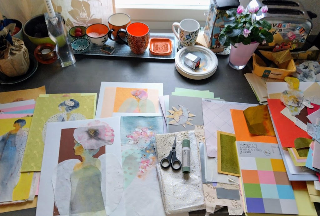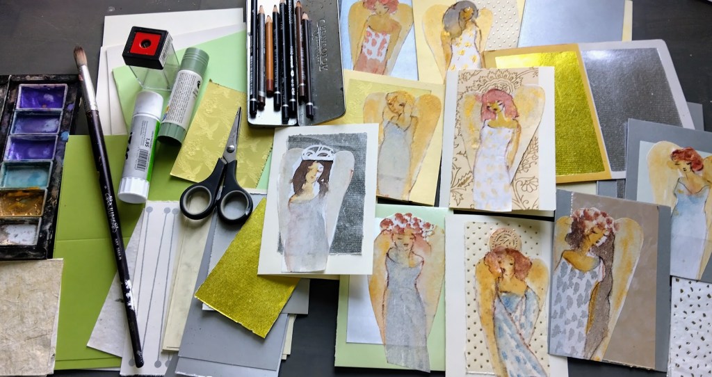 Joulukortit on lähetetty, tänä vuonna Pirpana-mallisia omatekoisia kollaaseja. Joulukortteja on saatu, enimmäkseen perinteisiä. Innostuin näin joulun edellä maalaamaan pieniä enkelikortteja. Voi olla, että ystävät saavat niitä ensi vuonna. Ei voi tietää… Laajensin mallistoa kukka-aiheilla. Totesin taas kerran, että askartelu on innostavaa.