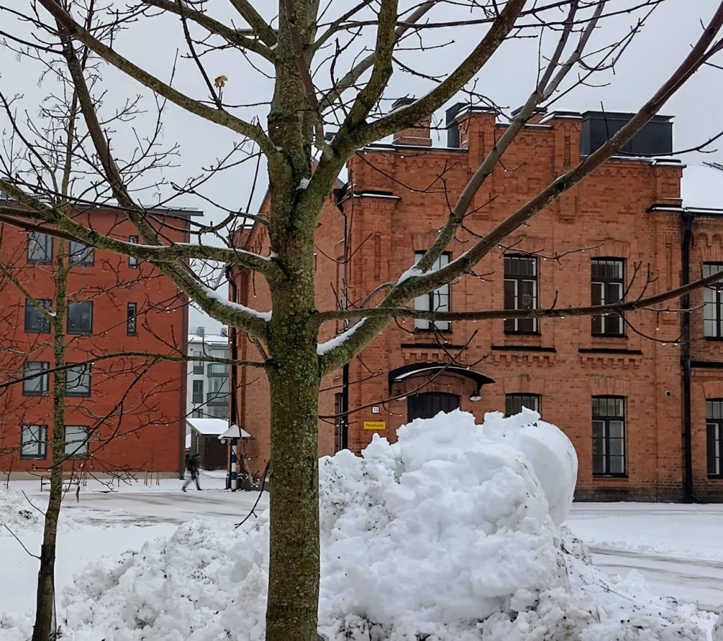 Aura oli käynyt ja kinoksia oli ilmestynyt eri puolille pihapiiriä. Viime talvena niitä oli runsaasti, mutta sulivat yllättävän nopeasti. Nämä tuskin jäävät pitkäksi aikaa.