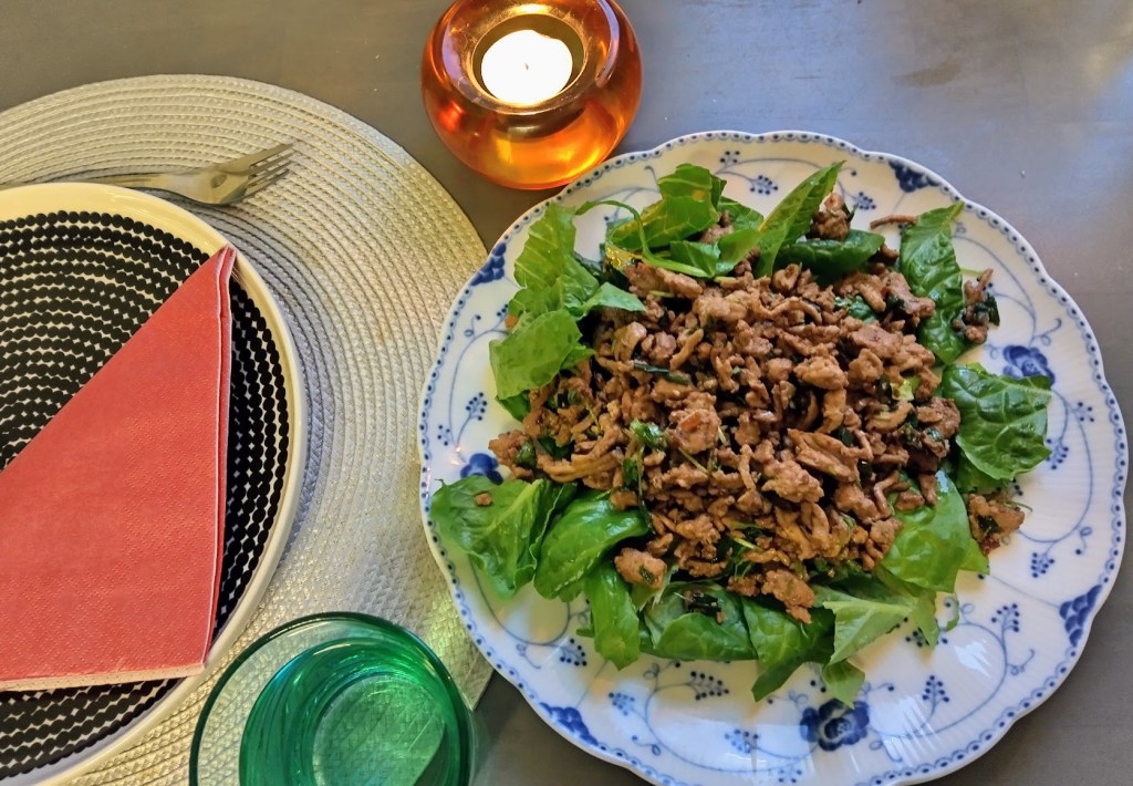 Jaana on ihastuttanut valmistamalla tulista ruokaisaa salaattia jo monesti. Pyysin ohjeen. Se löytyy Kariniemen sivuilta otsikolla Aasialainen kanasalaatti Larb Gai. Mausteita voi toki soveltaa sen mukaan mitä kotoa löytyy. Chili, korianteri, lime ja kalakastike ovat kuitenkin oleellisia.
