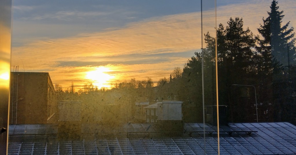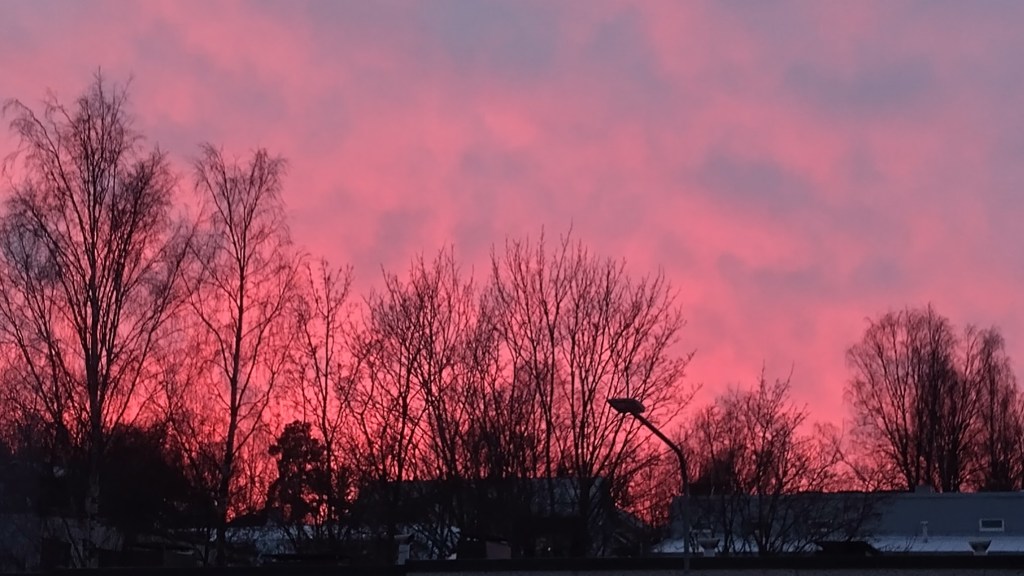 Päivä on ollut merkillinen. Hämmästelin, kun taivas hohti pinkkinä kolmen jälkeen.