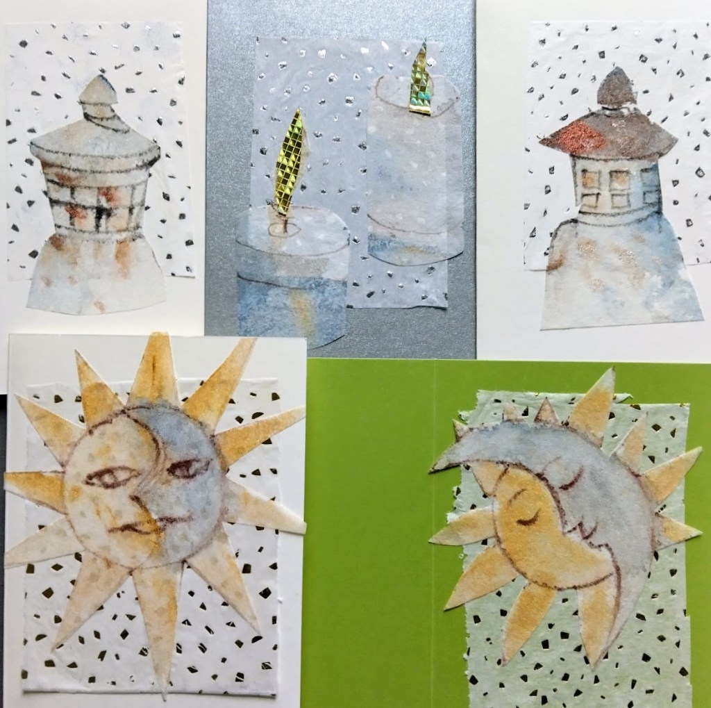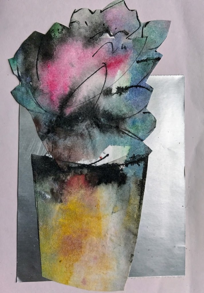 En kuitenkaan hylännyt enkeliteemaa, vaan olen jatkanut akvarelli-kollaasilinjalla. Tarinakin on tekeillä. Ehkä enkelit saavat uuden elämän kuvakirjana, ei voi tietää…