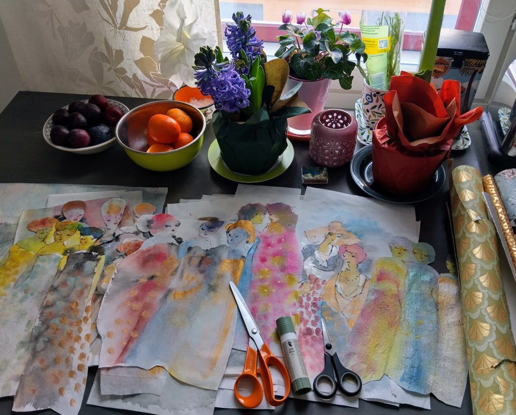 Otin akvarellineitoset uusiokäyttöön. Ajattelin antaa niille uuden ilmeen liimaamalla värikkäille pohjille. Osa saa tietenkin siivet ja osa kukkakoristeen – tai molemmat. Voi sitä talvipäiviä näinkin viettää.