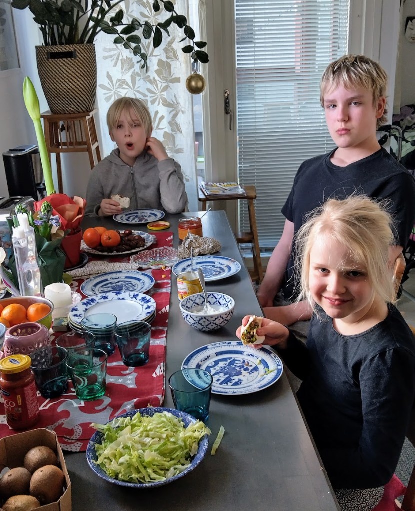 Miikan perhe tuli valoisan aikaan ja sisko tihkusateesta illan edellä. Säästin Jaanalle maistiaisia jouluruoista. Muille tortillat jauhelihan, papujen ja salsan kera maistuivat. Laura toi makeita kakkuja kahvin kaveriksi. Kissa ja koira eivät kohdanneet, sillä Pipa viihtyi parvekkeella. Fidel oli liikuttavan iloinen päästessään taas tuttuun ympäristöön.