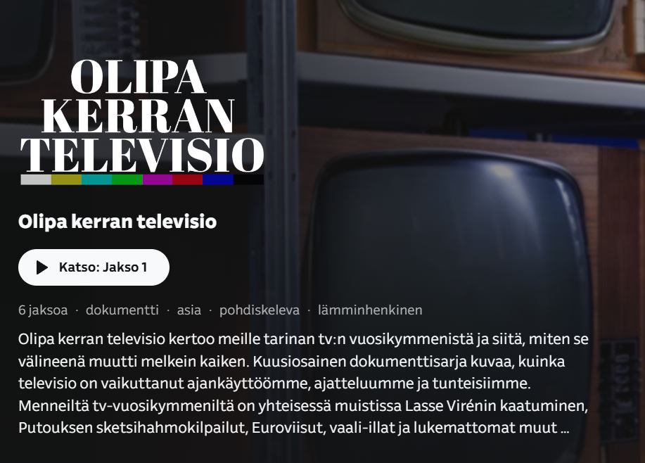 Aloitin myös toisen sarjan, joka onneksi ei ole spektaakkeli. Television historia on nuori ja kiehtova. Olen ollut etuoikeutettu saatuani olla mukana pioneerivuosina. En todellakaan tiennyt kuvaussihteerin toimenkuvasta ammatinvalintaa miettiessäni. Elämä voi yllättää.