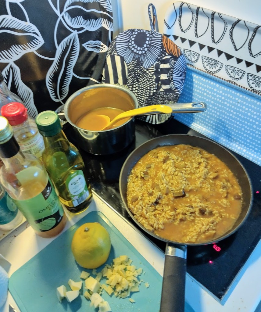 Jaana on tyhjentänyt pikku hiljaa pakastinta. Osa on päätynyt minulle. Sulatin pussillisen siskon keräämiä herkkutatteja ja kokkasin niistä mainion risoton. Salaisuus on maukas kuuma liemi, jonka sekoittelin kauhallinen kerrallaan riisin joukkoon.