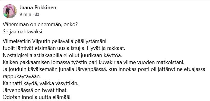 Uusi viikko on alkamassa. Pakkanen on hellittänyt alle kymmeneen asteeseen. Sain uuden siivoojan, kun Kodinportti teki järjestelyjä lyhentääkseen työntekijöiden matkoja. Niina tulee Rengosta. Oli mukava tutustua kahvikupposten äärellä.