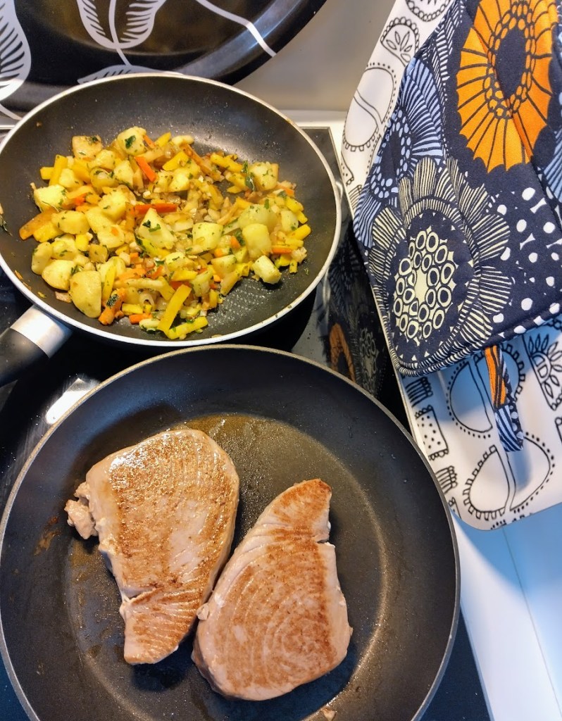 Jaana yllätti tuomalla kaupasta kunnon pihvit, jotka maistuivat mainioilta.