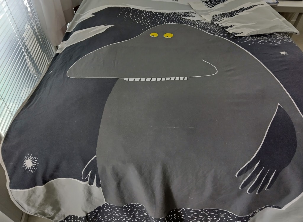 Pyöritin eilen pyykkikonetta siitä ilosta, että pörssisähkö oli kohtuullisen hintaista, ei tosin halpaa. Ripustin Mörkö-lakanan parvekkeelle kuivumaan. Otin sen kankeana aamulla sisälle toipumaan. Tuoksu on ihanan raikas.
