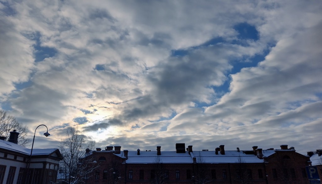 Tänään taivas on harmaa ja keli mukavan lauha. Pakkasta oli aamusella seitsemän astetta. Reippailin pitkän lenkin ja kävin kaupassa.