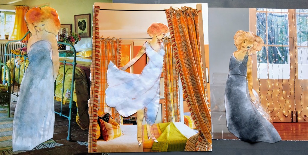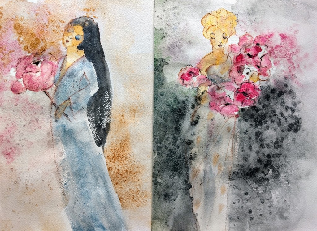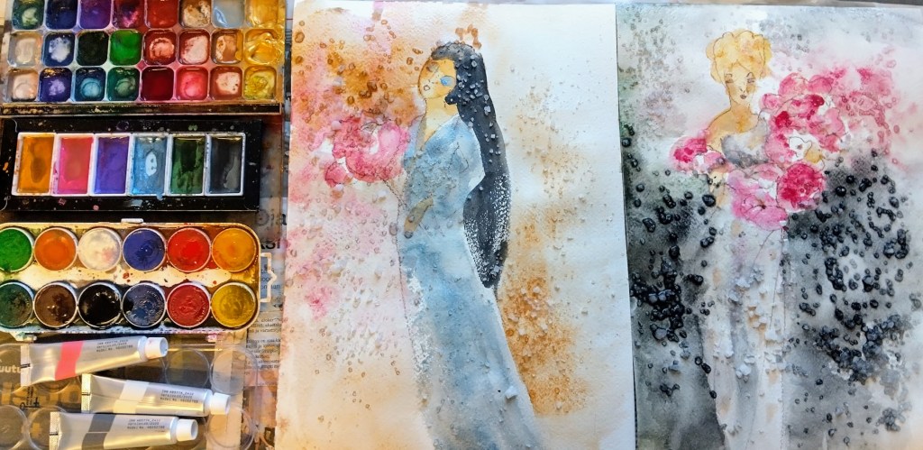 Viimeistelin eiliset akvarellit. Ilahdun edelleen, kun löydän neitosille sopivat taustat. Ehkä kehittelen vielä heille tarinatkin, ei voi tietää, mitä syntyy.