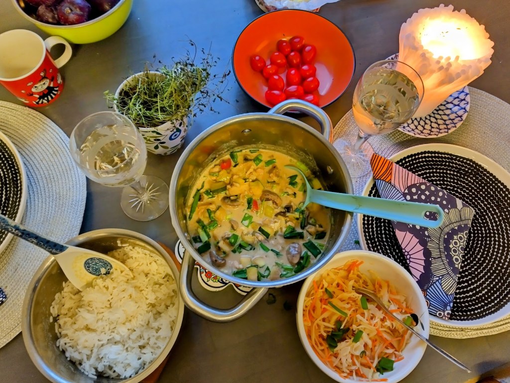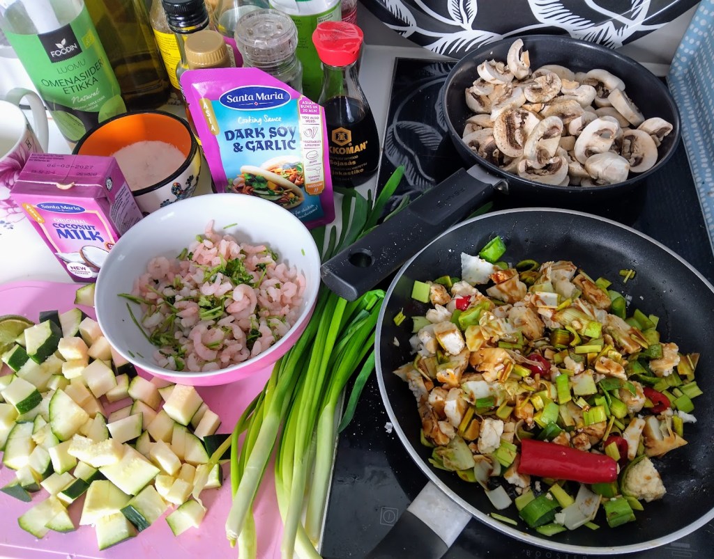 Laitoin katkaravut lime-öljy-yrttisuolamarinadiin. Kypsensin kasvikset pannulla maustekastikkeen kera. Yhdistin ainekset ja kuumensin kookosmaidossa. Tarkistin maun ja tarjosin padan basmatiriisin sekä coleslawn kera.