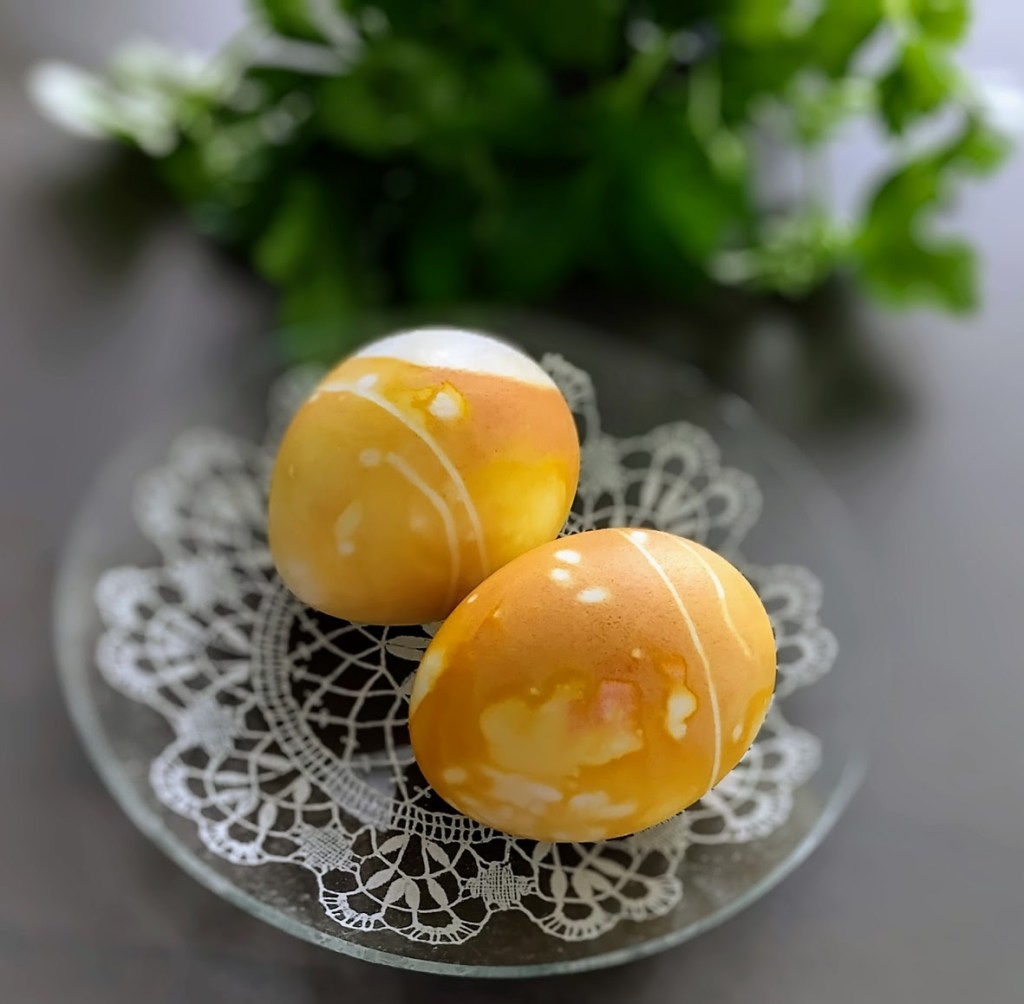PERINTEISIÄ SIPULINKUORILLA VÄRJÄTTYJA JA RIISIKORISTELTUJA KANANMUNIA