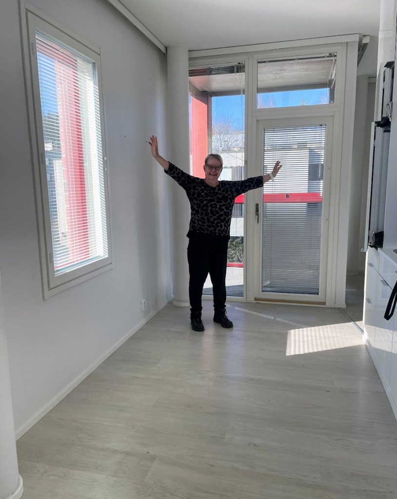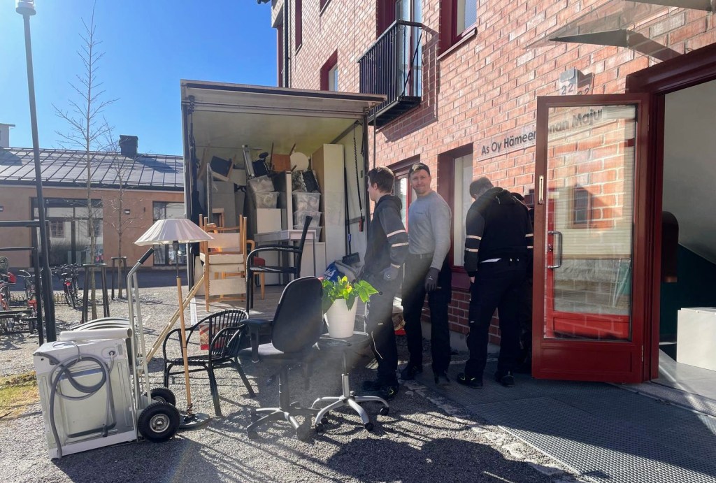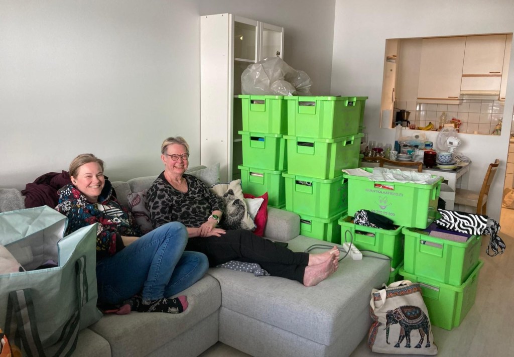 Täydellinen muuttopäivä. Aurinko paistoi heleästi ja ilmassa oli kevään tuoksua. Tehotiimimme aloitti eilen aamuvarhain. Anna ja Miika tulivat termospullokahvien kera. Heidän lisäkseen muuttomiehiä oli kolme. ”Paljon olet saanut tavaraa mahtumaan kaksioosi”, yksi heistä totesi, kun kannettavaa riitti. Selvisimme puolessatoista tunnissa matkaan.
